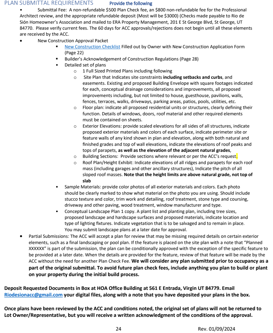 Before designing your home, please review the CC&R's and all amendments for a complete list of specifications for construction elements, materials, and design. Please also review the Architectural Design Guidelines (ADG) for further guidance on your design. You can download a packet of the instructions for submitting and the forms by clicking here. Please submit a $500 Application Fee, $800 Architect Review Fee and a $3000 Construction Deposit payable to Rio de Sion Homeowner's Association, 1 hard copy sets of plans, 1 digital copy of plans along with your samples. Box it up securely for the Architectural Control Committee review. Please leave inside the toolbox on the front porch of the sales office located at 561 E. Entrada Drive (the Adobe building on the left side of the street just past the Rio de Sion entrance sign). Please clearly write your name, builder's name, lot number, and contact information on the box and email the ACC including your digital files when you have dropped off your package to arrange for pick up. Email - Riodesionacc@gmail.com.